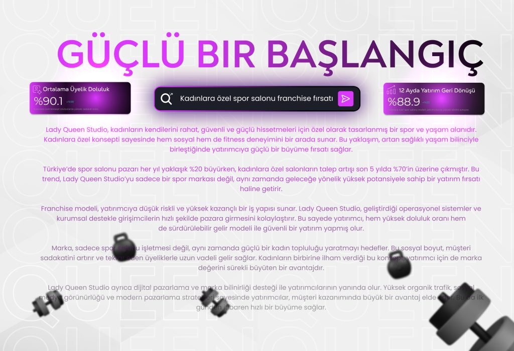 Türkiye genelinde büyüyen kadınlara özel stüdyo modelimizi, kanıtlanmış işletme standartları ve merkezi destek yapısıyla girişimcilere sunuyoruz.