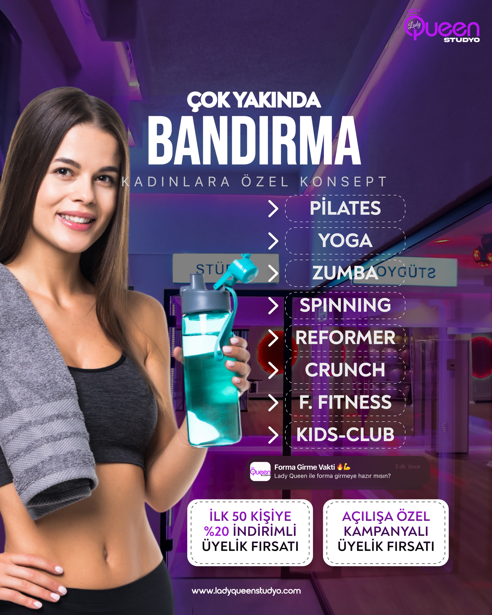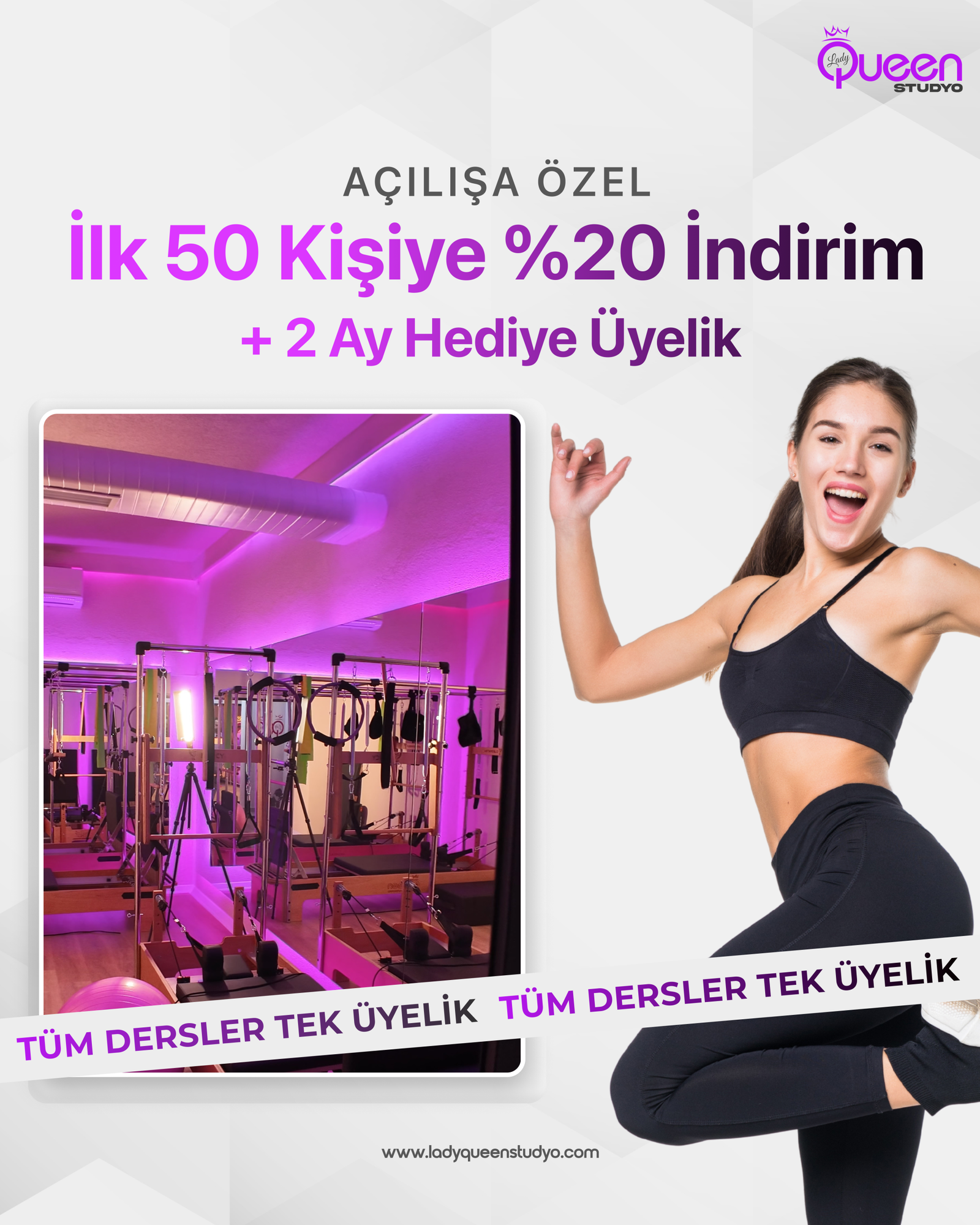 Profesyonel antrenörler eşliğinde hem bedeni hem zihni güçlendiren, özel aydınlatma ve ambiyansıyla motive edici bir ortam sağlayan Lady Queen Stüdyo, sporu günlük hayatın vazgeçilmez ve keyifli bir parçası haline getiriyor.